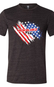 Get extra Patriotic with this newly released Rokblokz logo design . The Flag logo is printed on the front of the shirt in Red, White and Blue with the RB logo printed on the sleeve.