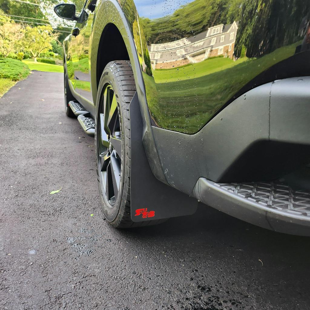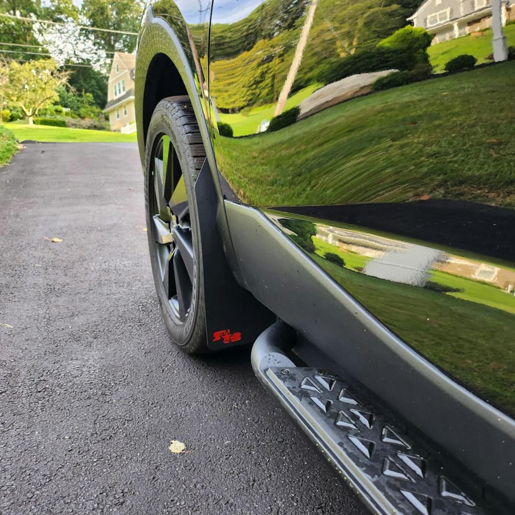 - Flexible but with a semi-rigid characteristic that allows them to retain their shape at speed and effectively block tire spray (we're not into flappy mud flaps).
