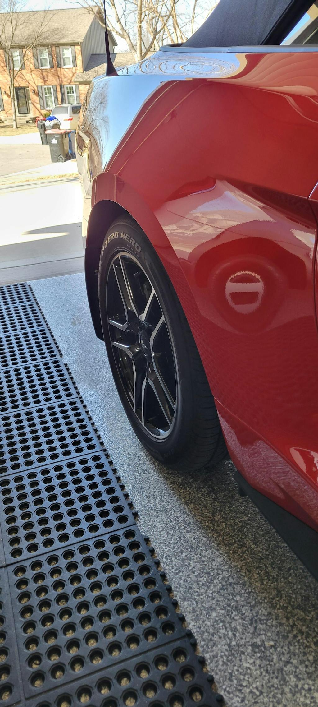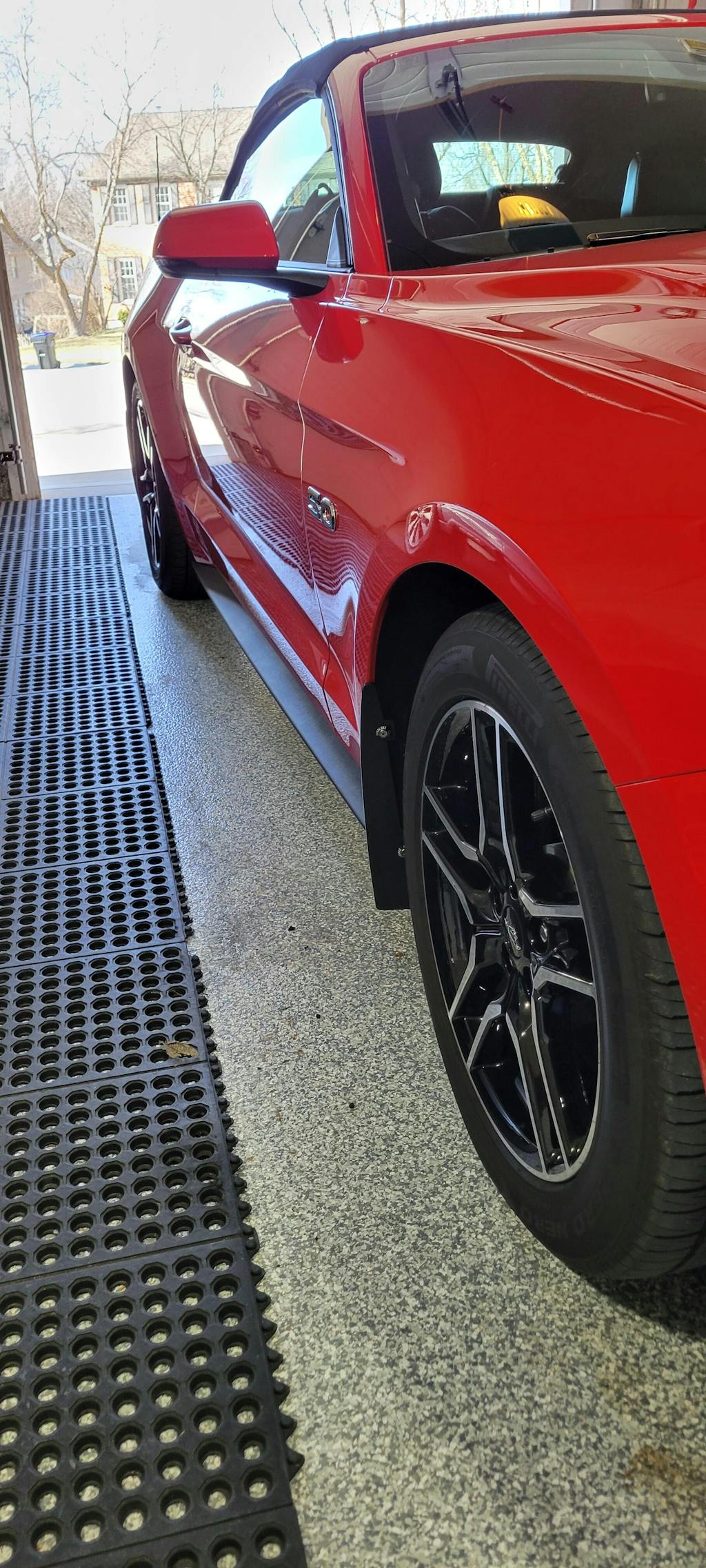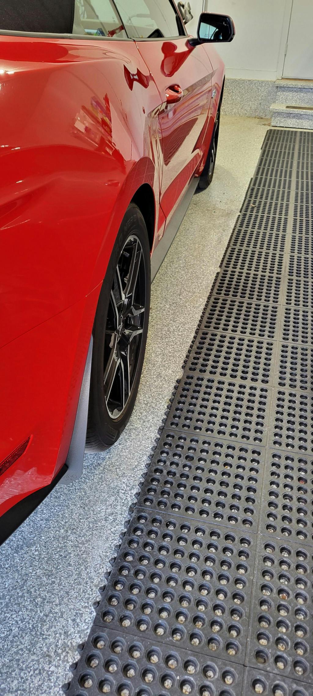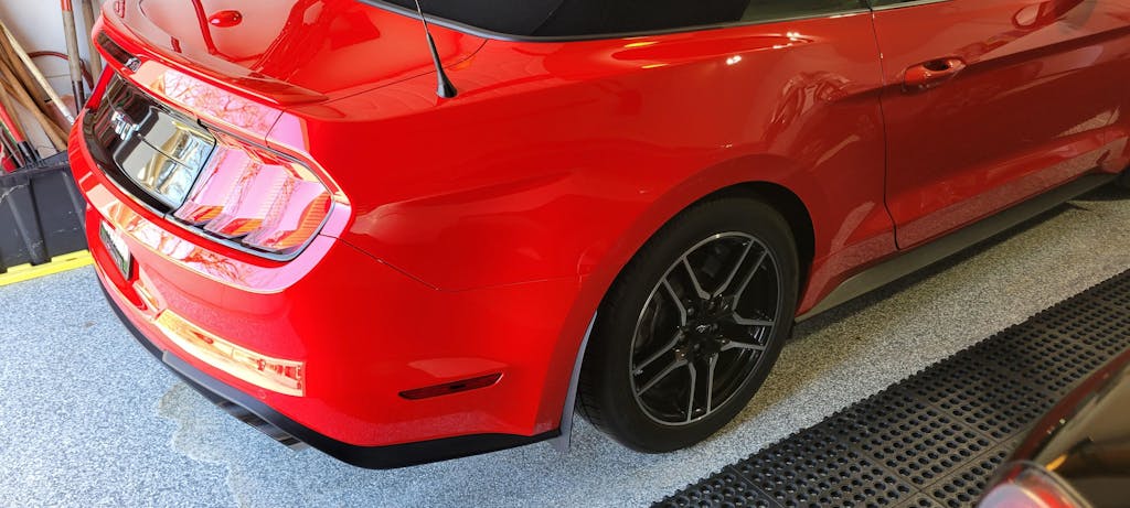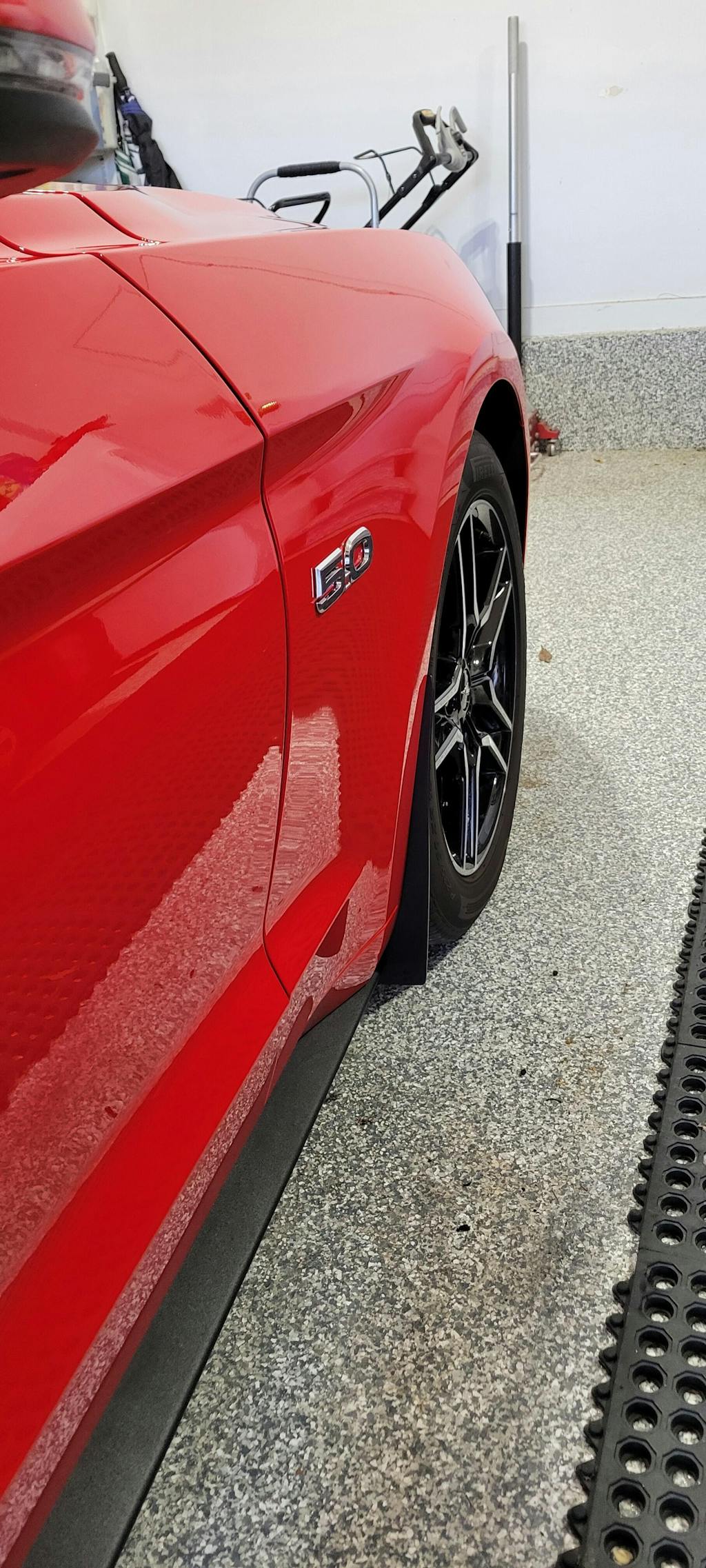 -PP2 V6: Splash Guards were designed for the Mustang GT Performance Pack 2 and features larger more aggressive Splash Guards in the front which fits the wider wheels on the PP2 Version.