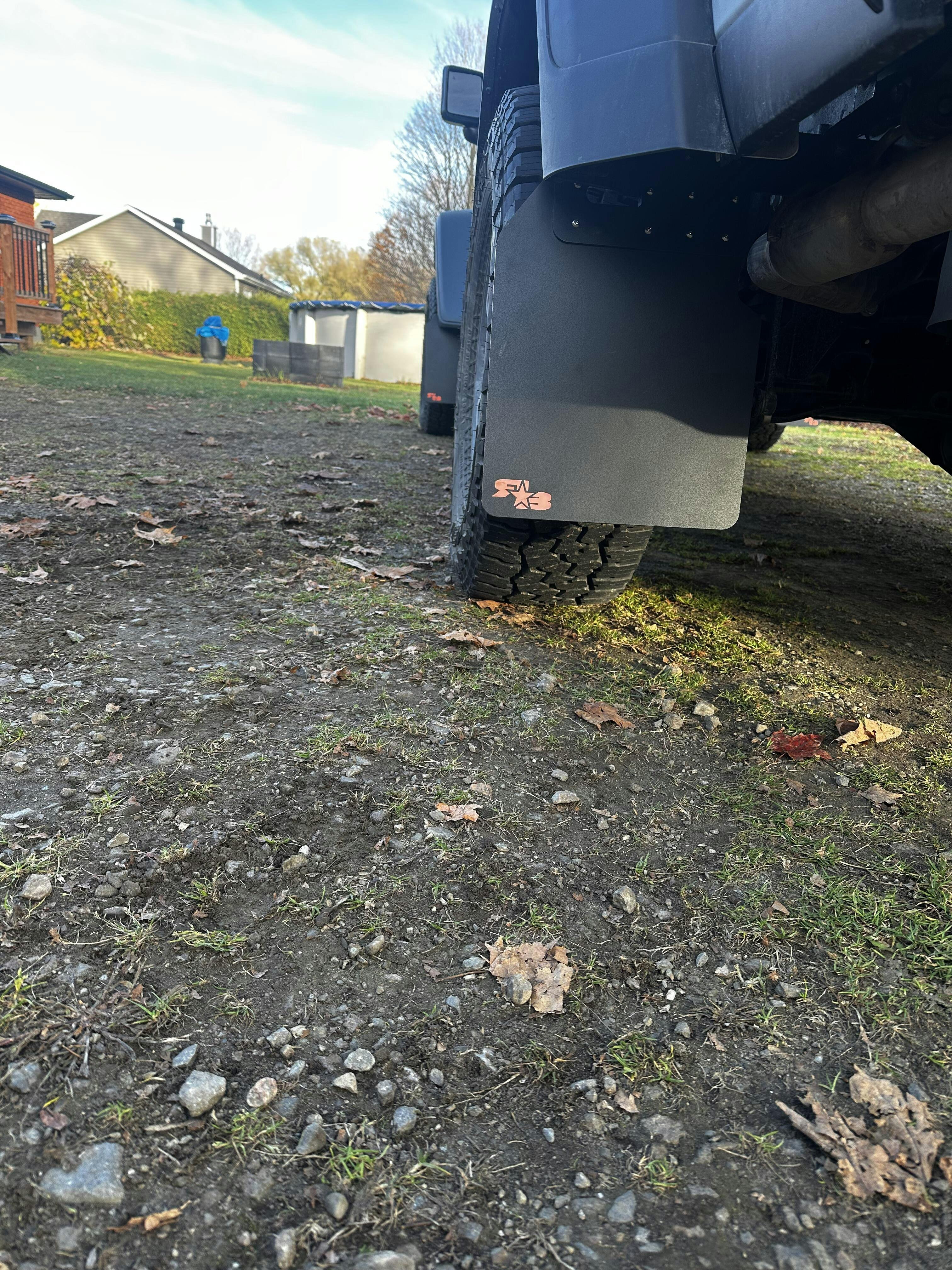 The REAR FLAPS are mounted to a heavy-duty powder-coated steel bracket that mounts directly to the Frame of the Vehicle. This bracket makes it possible to adjust the flaps in and out to account for a range of tire size and wheel offset. Because of this bracket system, you can easily remove the flaps without any tools right on the side of a trail if needed.