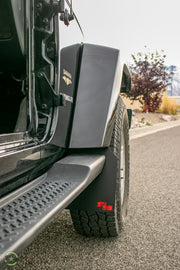 TheĀ REAR FLAPSĀ are mounted to a heavy-duty powder-coated steel bracket that mounts directly to the Frame of the Vehicle. This bracket makes it possible to adjust the flaps in and out to account for a range of tire size and wheel offset. Because of this bracket system, you can easily remove the flaps without any tools right on the side of a trail if needed.Ā Ā Ā