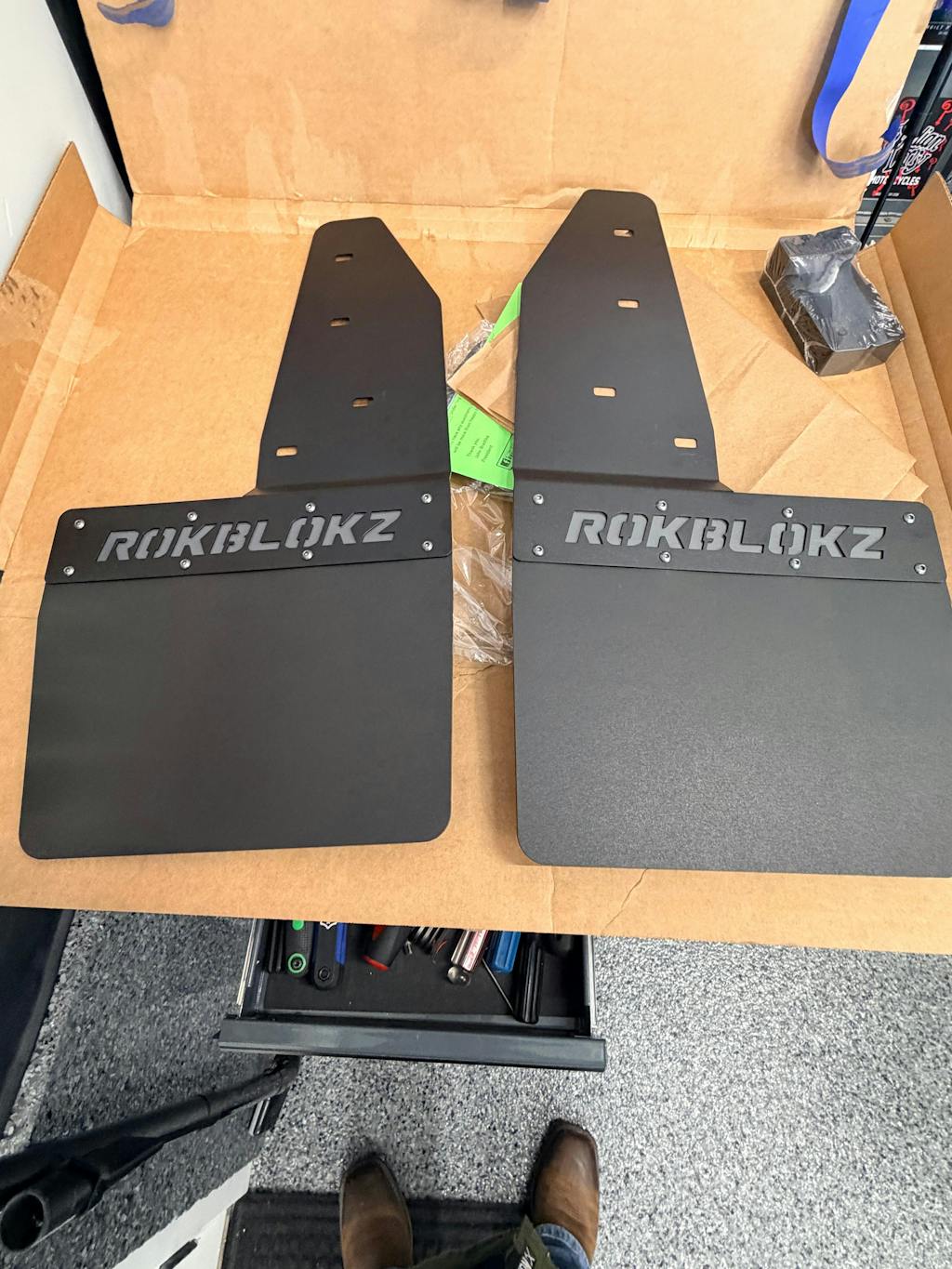 Each RokBlokz Step Back mud flap set for the 4th Gen F-250 F-350 Super Duty comes with 4 Main Stainless steel brackets w/black powder coat finish (2 front and 2 rear), 4 Flaps (2 Front and 2 Rear), stainless steel & rust-resistant mounting hardware, and instructions to fit factory hole locations. **Requires drilling 2 small holes in plastic fender trim/edge to gain access to OEM mounting holes behind.