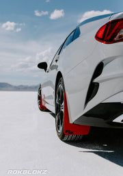 Rokblokz mud flaps are Extremely durable, flexible, lightweight, and rigid! These characteristics come together, allowing the flaps to extend out past the edge of the fender enough to be effective while retaining their shape at speed and being able to bend, flex, and drag without breaking instead of flapping around like a limp noodle. So tear up the asphalt in your Optima with confidence knowing that your vehicle is protected from rocks and debris.