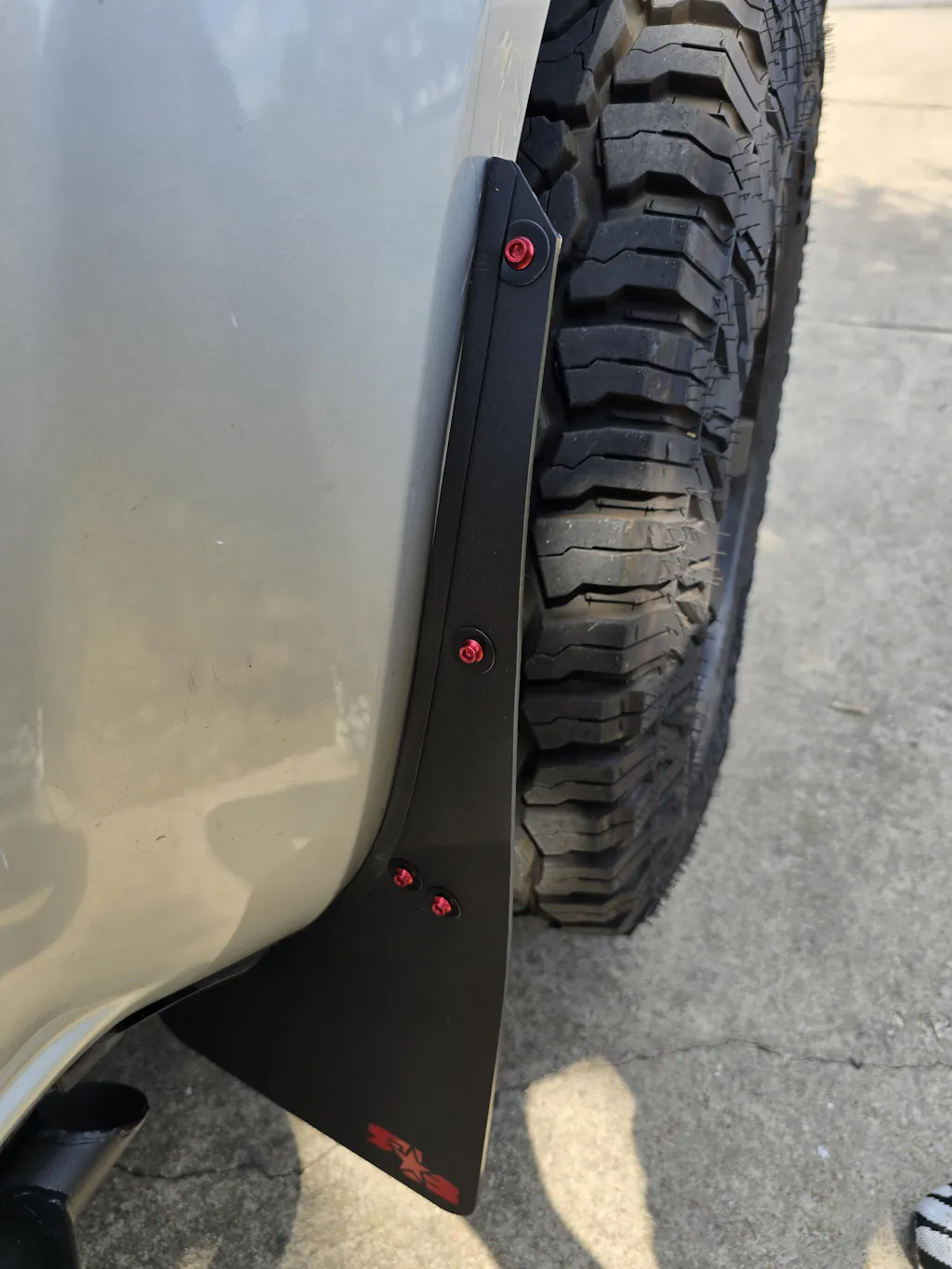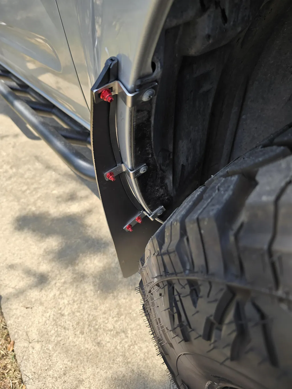 - Uses specially designed brackets to hold the front mud flaps outside of the wheel well as even slightly oversized tires will rub the inner wheel well leaving no room for mud flaps.