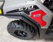 - Excellent protection from wheel spray off the front and rear wheels without making your RZR 570 TRAIL too wide.