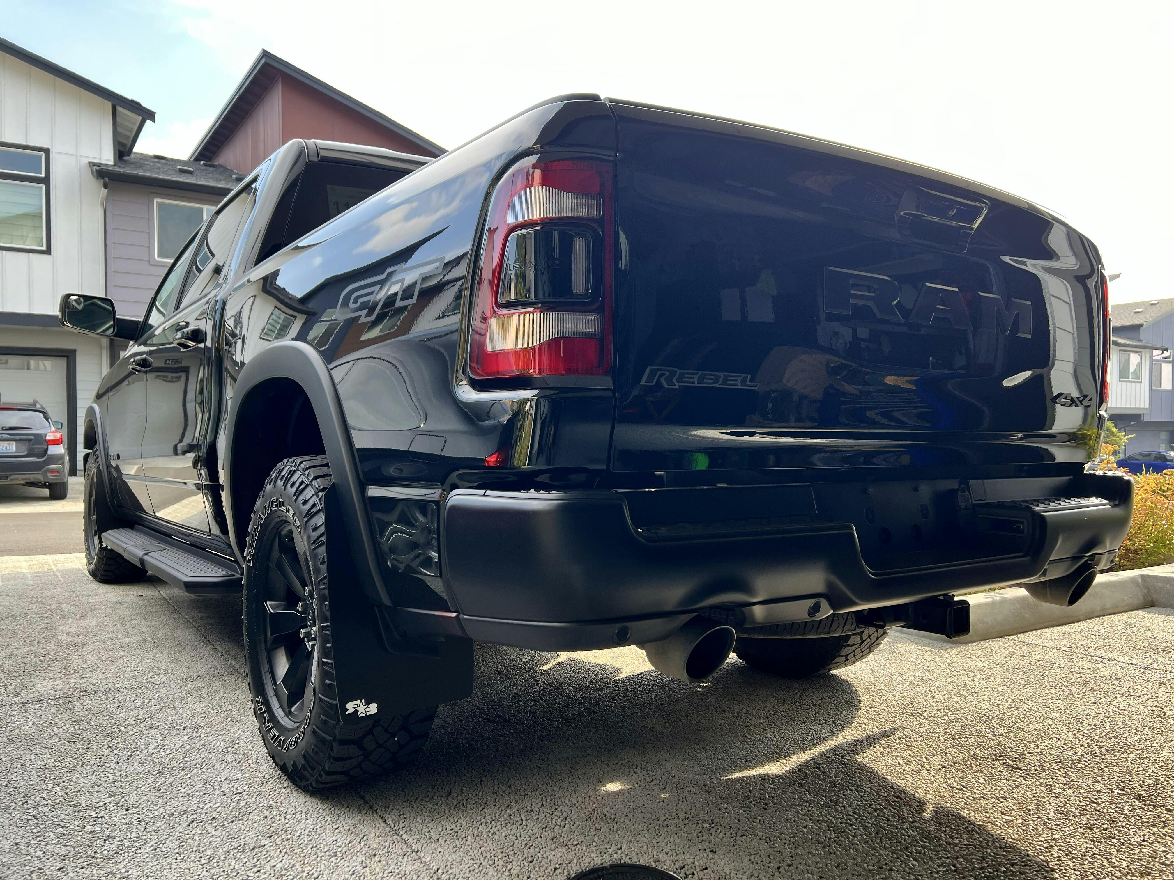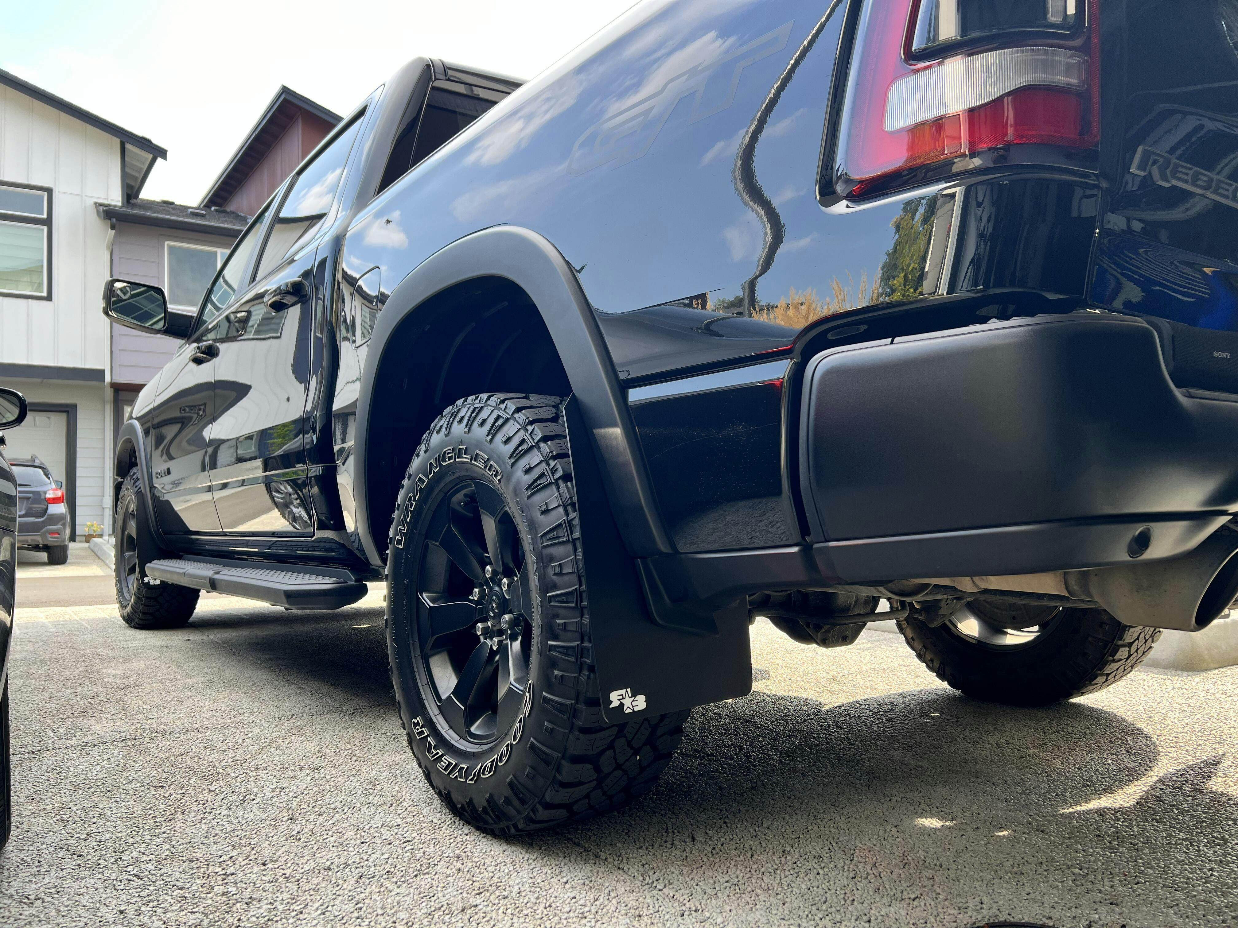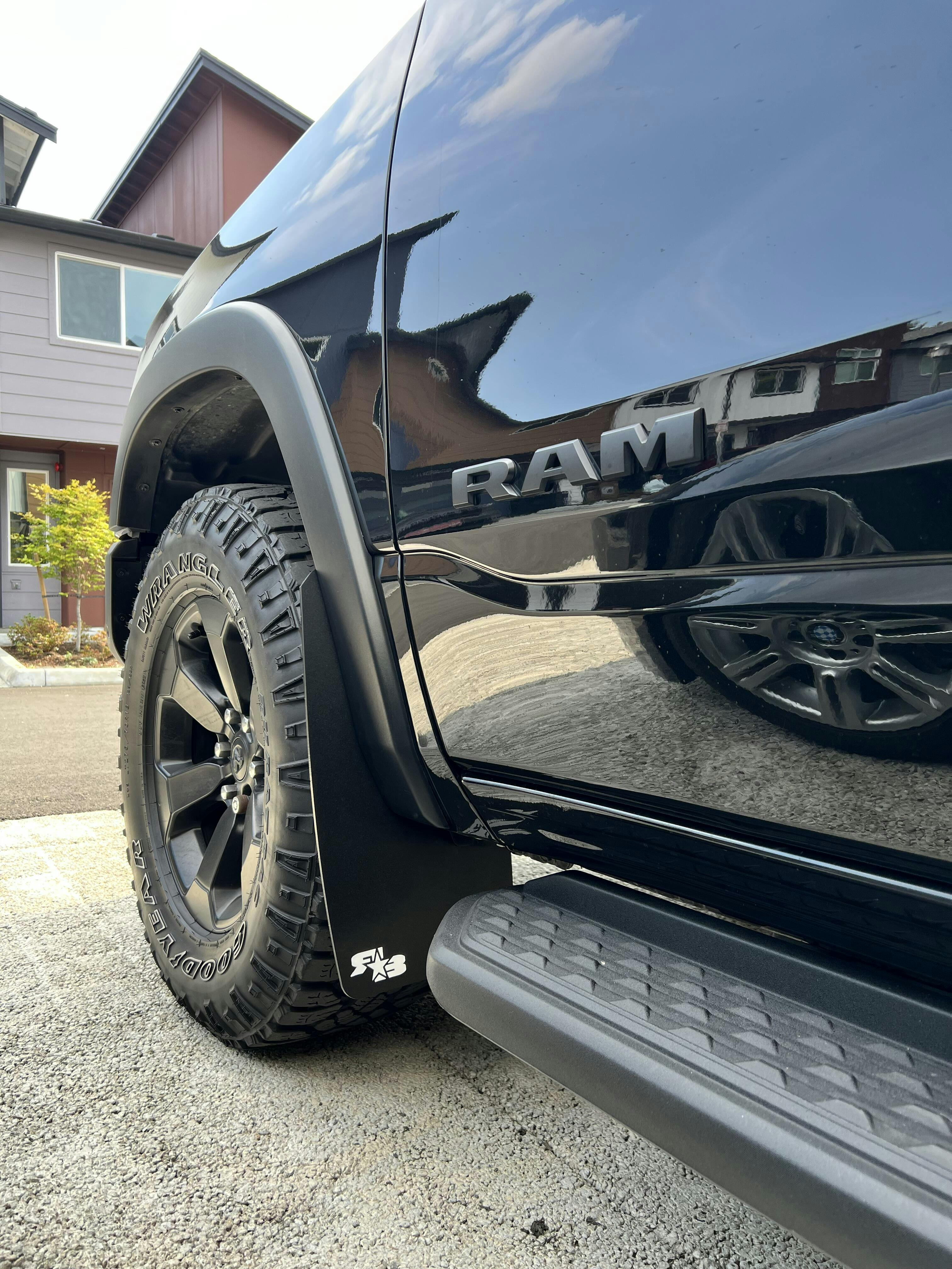 Each RokBlokz mud flap set for the new RAM 1500 comes with 4 flaps (front and rear), stainless steel and rust-resistant mounting hardware, and instructions to fit factory hole locations.